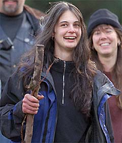 當「茱莉兒」從那棵她「樹坐」了兩年又八天的紅巨木下來的 時候,她隨及激動的跪下,親吻兩年來所不曾觸及的芬芳土地 ,然後獨自跪坐縮成一團,哭泣不能自己,旁邊,她的朋友、 親人、支持者,莫不跟著感動落淚。