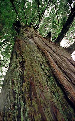 ■月神 一九九七年十月,「地球第一!」的成員在史塔佛(Stafford) 地區上方的山脊某處,聽到有電鋸伐木的聲響,他們途步進入 探查,發現一個新的伐木區正在進行著,而在山頂上,他們發 現挺立著一株高約200呎(約六十公尺),直徑約15呎(約四點六 公尺)的巨大紅木,樹幹上被噴灑上藍色的油漆,顯示這株古 老的巨木,即將遭受被砍伐的命運。
