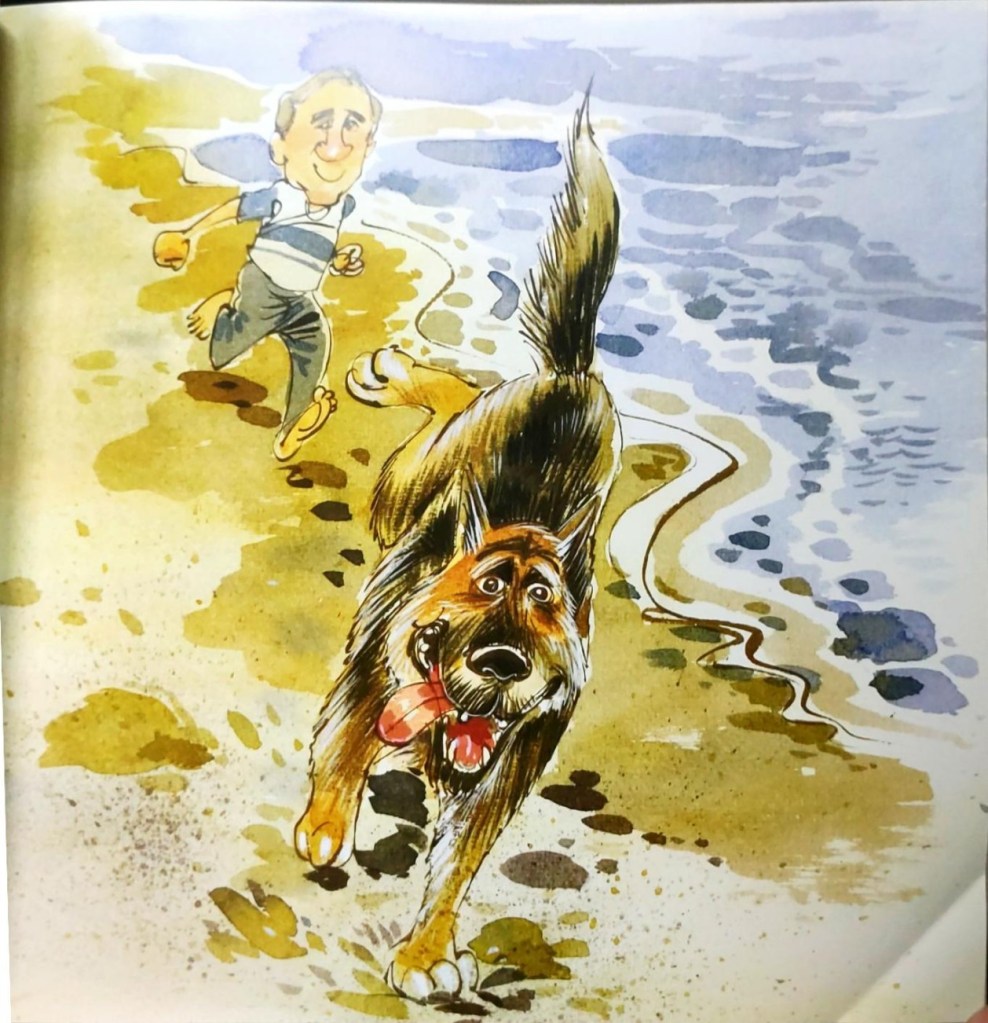 那是一處,除了海鳥外,遠離一切,有著硬沙子的海灘,我們必須找這樣的場所,因為即使是在這樣一個美好的夏日天裡,我那私人的老師,在娛樂界是如此重要的一項資產,所以經不起遇到其他的狗兒,或是其他會讓牠感覺不友善的人們在附近出現。當卸下我們的午餐裝備,一條毯子,幾本書,和一些雜物,我們將學校總部設在一個沙丘上,從那兒可以一覽無餘的看到四周的景緻。就像我一直儘可能的和史強哈特分享一切,即使在這次遠足也不例外,我讓牠幫忙從車子裡搬運一些雜物,並且幫忙佈罝,如果考慮到牠沒有手的話,牠做的實在出色極了。當一切就緒後,我盤腿坐在毯子中央,然後我正式的朝著牠點了點頭,牠已經等得有點不耐煩了,等收到我正式的通知後,一眨眼,牠就飛快的奔了出去,從那刻起,我的課程也開始了。