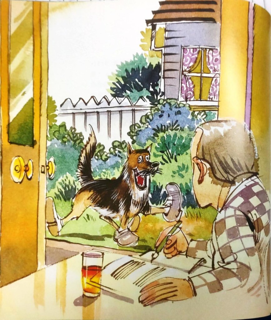 牠的習慣是,每天早上準時六點整,牠總充滿活力熱勁的、自動自發的從床上一躍而起,牠不需要人家開門放牠出去,因為牠自己會打開所有的門自己出去。在我的臥房和客廳間,有一扇老式不好開的的門,這多多少少會阻礙牠的進出,而牠也把這扇門視為是對牠的妨礙,所以牠會在喉嚨間發出濃濃的怒吼聲,用牠強而有力的下顎緊緊夾住門把,然後用牠一百二十五磅的身軀,使盡全力的將門推開。然後在不到一個小時內,牠會再度跑回臥室內,渾身充滿清晨的精力和興奮,然後開始對我吠叫,提醒我,是該起床和工作的時候了,尤其是準備牠的早餐。如果牠沒有得到任何的回應,那牠就會把床單、床被拖到遠處的地板上,如果還是沒得到任何回應的話,那牠就會咬住我的睡袍,然後用力的拉,直到我或者是一部份的睡袍,被拉到地板上為止。